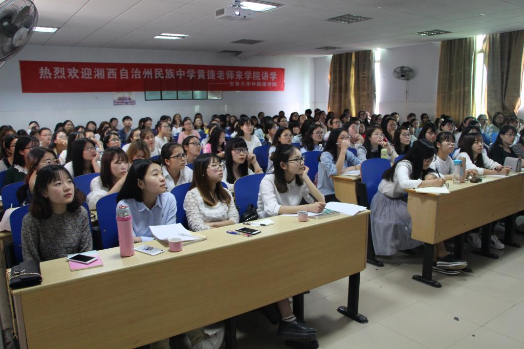 本网讯(通讯员 丁柏顺 龙锐 张丽娜)5月5日下午,逸夫楼3416教室座无虚席。太阳成集团tyc33455cc特邀湘西自治州民族中学高二年级英语备课组组长黄捷老师来公司讲座。本次讲座由公司党委书记石红梅主持,黄捷老师主讲,公司2014级英语师范班150余人参加。
