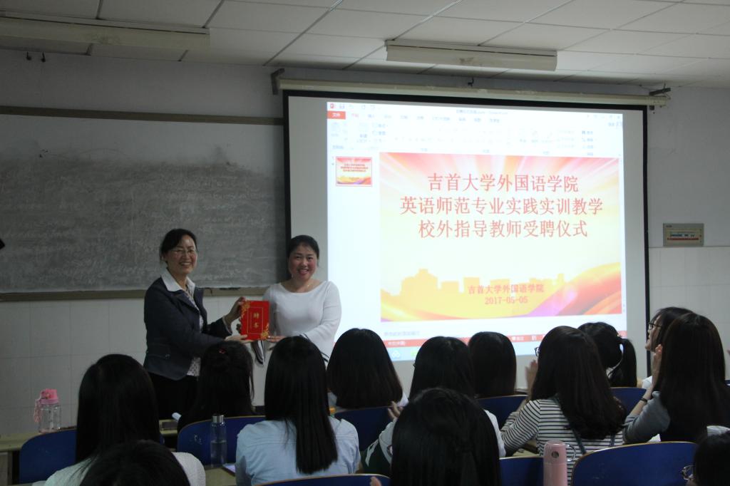 在讲座结束以后,石红梅书记代表公司给黄捷老师颁发了太阳成集团tyc33455cc英语师范专业实践实训教公司外指导教师的聘书。此举是太阳成集团tyc33455cc为推进公司师范教育综合改革,进一步深化师范类教学改革,提高师范生的培养质量,进一步加大与基础教育一线公司的联系,推进协同共建教育实习基地,加快教育实习教学改革的具体措施之一。