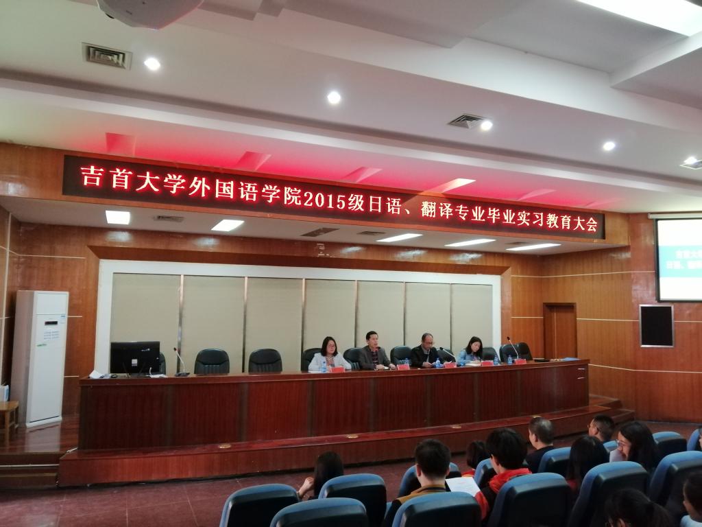 本网讯(通讯员 张光辉)为确保公司员工外出实习教学活动的顺利进行,3月27日下午,太阳成集团tyc33455cc于逸夫楼多功能厅举行2015级员工毕业实习教育大会。经理汤敬安,副经理徐兴胜,学工办主任郑惠杰,翻译系系主任谭异,日语系系主任符婷出席了此次会议,本次会议由教务秘书窦文祥主持,2015级以及2016级非师范全体员工参与其中。