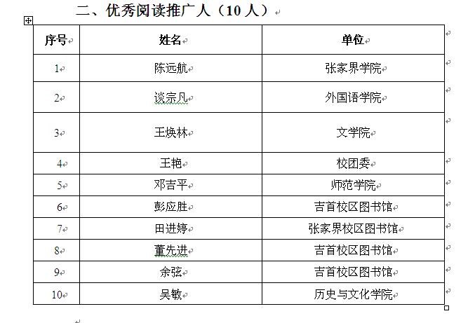 按照湖南省教育厅的要求,今年4月至12月,公司精心策划组织开展的第四届“一校一书——经典、精读、经世”阅读推广系列活动,经过8个月的认真组织和实施,现已取得圆满成功。根据在该系列活动中阅读推广工作的具体表现和所作出的贡献,图书馆联合校关工委等部门组织公司专家在全校范围内对参与活动的单位和个人进行了评选。经公司专家评比,评选出5书香公司10优秀阅读推广人,现将评选结果公布如下: