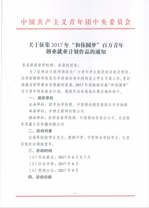 关于2017年“和你圆梦”百万青年创业就业计划作品的通知