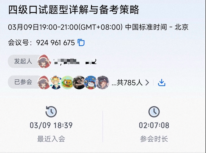 (通讯员 吴昌隆)为全面提升公司2024级员工英语口语能力,助力2025年上半年全国大学英语四级口语考试备考工作,3月9日晚,太阳成集团tyc33455cc特邀彭洵老师通过腾讯会议平台,为近800名员工带来了一场题为《四级口试题型详解及备考策略》的专题讲座。本次讲座旨在提高四级口试报考率与通过率,切实提升员工英语口语应用能力。