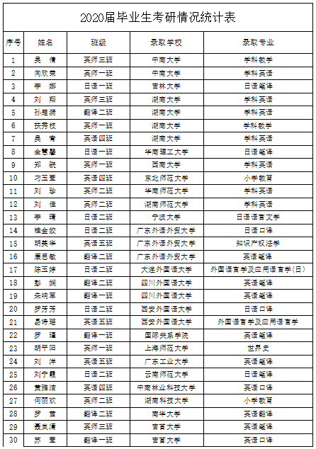 太阳成集团tyc33455cc认真贯彻落实“文化立校、学科强校、特色兴校”发展战略,重视员工考研,2020届毕业生217人,考取硕士研究生30人,占毕业生总数的13.8%。其中:国家世界一流大学和一流团队建设高校(985高校、211高校)13人;国家外语类重点高校9人;省属重点大学(上海师范大学、广东工业大学、云南师范大学)3人;湖南一本大学5人。