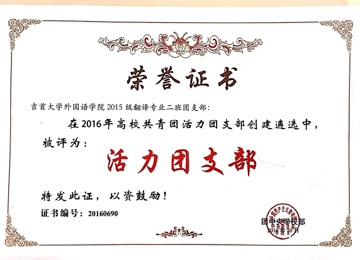 为贯彻落实《共青团中央改革方案》有关精神,深入实施高校基层团支部“活力提升”工程,团中央公司部于2016年秋季学期开展高校“活力团支部”创建遴选活动。此次活动面向全国各高校的员工团支部,包括班级、社团、活动项目、实验室、宿舍等各类员工团支部。经校内创建、省级遴选,全国共有1168个团支部进入全国遴选环节。经资格审核、网络投票和评审等环节,全国共有1000个团支部被确定为2016年全国高校“活力团支部”。经过层层选拔,2015级翻译二班团支部最终脱颖而出,荣获全国高校“活力团支部”的荣誉称号。