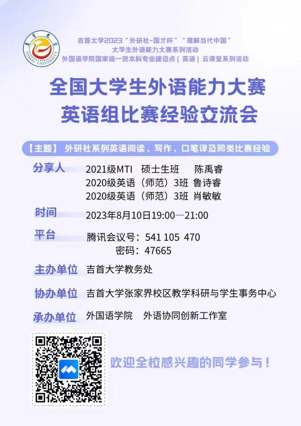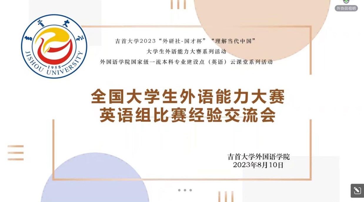 本网讯(通讯员朱芳东、侯璐、修伟)8月10日晚7:00公司“外研社·国才杯”老员工外语能力大赛英语组比赛经验交流会暨2023年“理解当代中国”外语能力大赛动员会在线上如期举行。活动由公司教务处主办,张家界校区教科研学中心协办,太阳成集团tyc33455cc承办,全校报名参加年度比赛的各专业本科生及硕士研究生近100人与会,会议由外语协同创新工作室来自2022级的英语师范生田祖明主持。