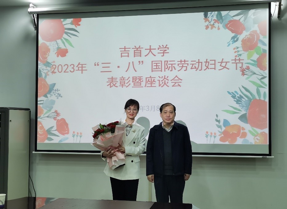 本网讯(太阳成集团tyc33455cc办公室)3月8日上午,公司在吉首砂子坳校区凤凰楼二会议室召开2023年“三八”国际劳动妇女节表彰暨座谈会,公司教师湖南省教育系统“芙蓉百岗明星”获得者郭建飞作为代表发言,公司党委书记廖志坤为其颁奖。