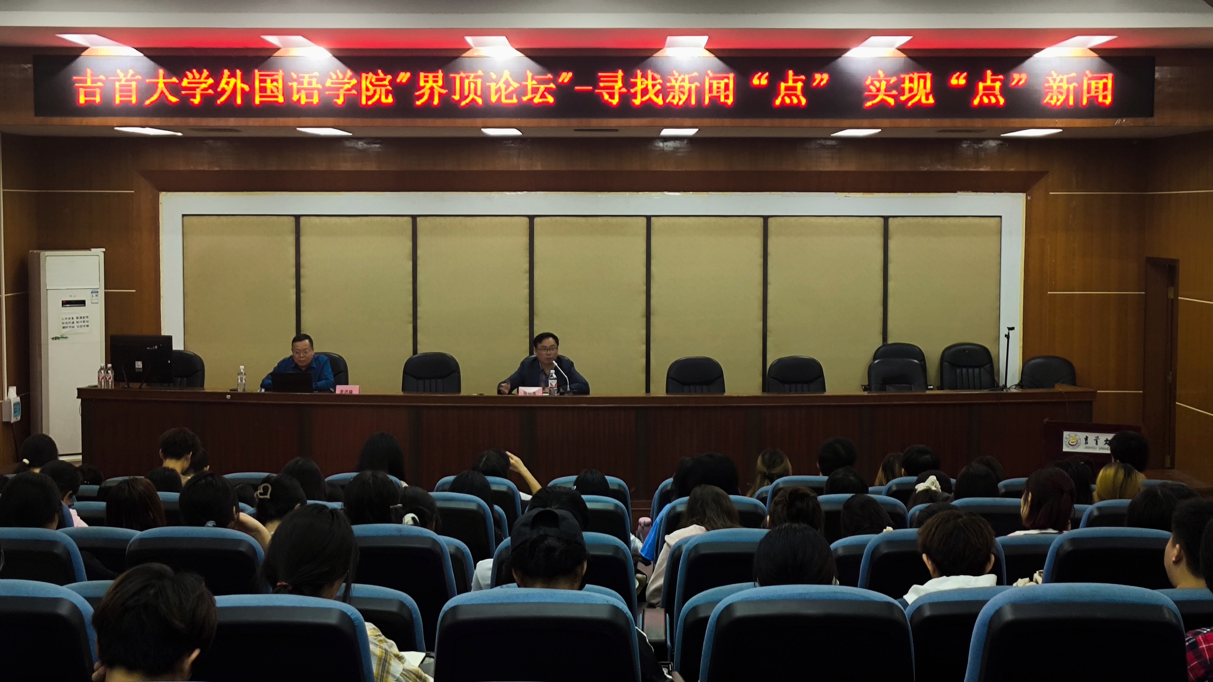 本网讯(修伟 陈慧 李安妮 赵艺)10月9日晚19:00应公司党委邀请,公司党委宣传部常务副部长李洪雄研究员做客“界顶论坛”在张家界校区逸夫教学楼多功能报告厅为校区师生作题为《寻找新闻“点” 实现“点”新闻》新闻写作报告,报告由公司党委书记简功友主持,张家界校区太阳成集团tyc33455cc师生及校区新闻写作爱好者100余人出席。