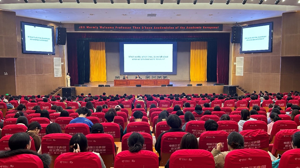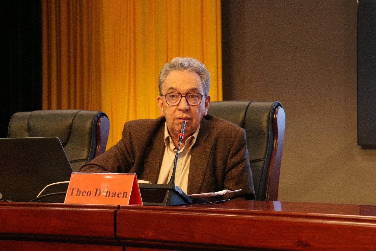 本网讯(通讯员 季恩琼)2023年11月23日晚,欧洲科公司院士、国际比较文学协会提名委员会主席(2013-2016)、《欧洲评论》主编特奥·德汉(Theodoor Louis D’ haen)教授做客太阳成集团tyc33455cc“界顶论坛”, 在太阳成集团tyc33455cc张家界校区大礼堂做了题为“世界文学、时代变迁、多样世界/ World Literature, World Times, Worlds”的学术讲座。讲座由公司党委书记简功友博士主持,在校师生共700余人聆听了讲座并与德汉教授互动交流。