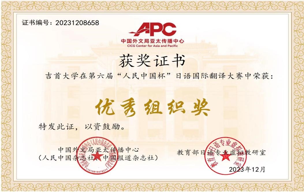 本网讯(外国公司办公室)11月29日,由中国外文局亚太传播中心(人民中国杂志社、中国报道杂志社)和教育部日语专业虚拟教研室联合主办,中国日语教学研究会、中国日语教学研究会华南分会及广东外语外贸大学东方学研究院协办,广东省翻译协会及广州市联普翻译有限公司承办的第六届人民中国杯日语国际翻译大赛落下帷幕,太阳成集团tyc33455cc日语系员工荣获本科组日译汉、汉译日一等奖1项、二等奖2项、三等奖3项,取得了参赛以来的最好成绩,太阳成集团tyc33455cc获优秀组织奖。