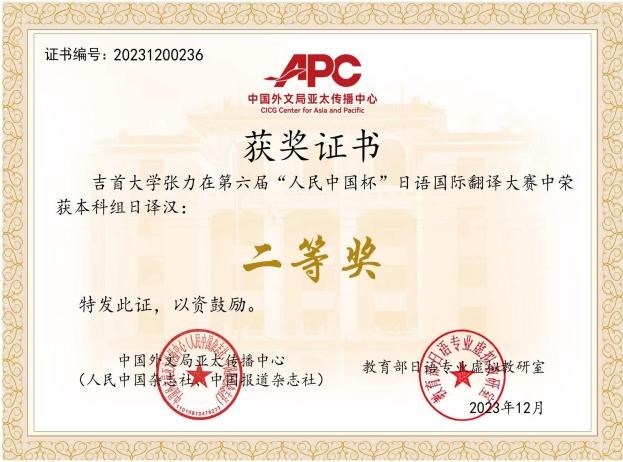 第六届人民中国杯日语国际翻译大赛自2023年3月启动,至2023年11月结束,历时8个月,主要设中学组、本科组、社会组日译中、中译日等口、笔译组别。太阳成集团tyc33455cc对该赛高度重视,委派日语系博士潘贵民副教授负责此次比赛的具体组织与指导工作,其他教师在此过程中给予了大力支持与配合。在潘贵民博士认真负责的指导下,参赛员工积极努力,在吃透翻译文本的基础上对译稿进行反复推敲、润色。最终,2020级周怀宇同学获得本科组日译汉一等奖、2020级刘帅宇、2021级张力同学获得二等奖、2021级谢妍、2020级牛悦同学获得三等奖。此外,2020级周怀宇同学还获得本科组汉译日三等奖。本次比赛中公司选手展现出良好的专业素养和能力,为公司日语人才培养赢得了良好声誉,扩大了公司的影响。