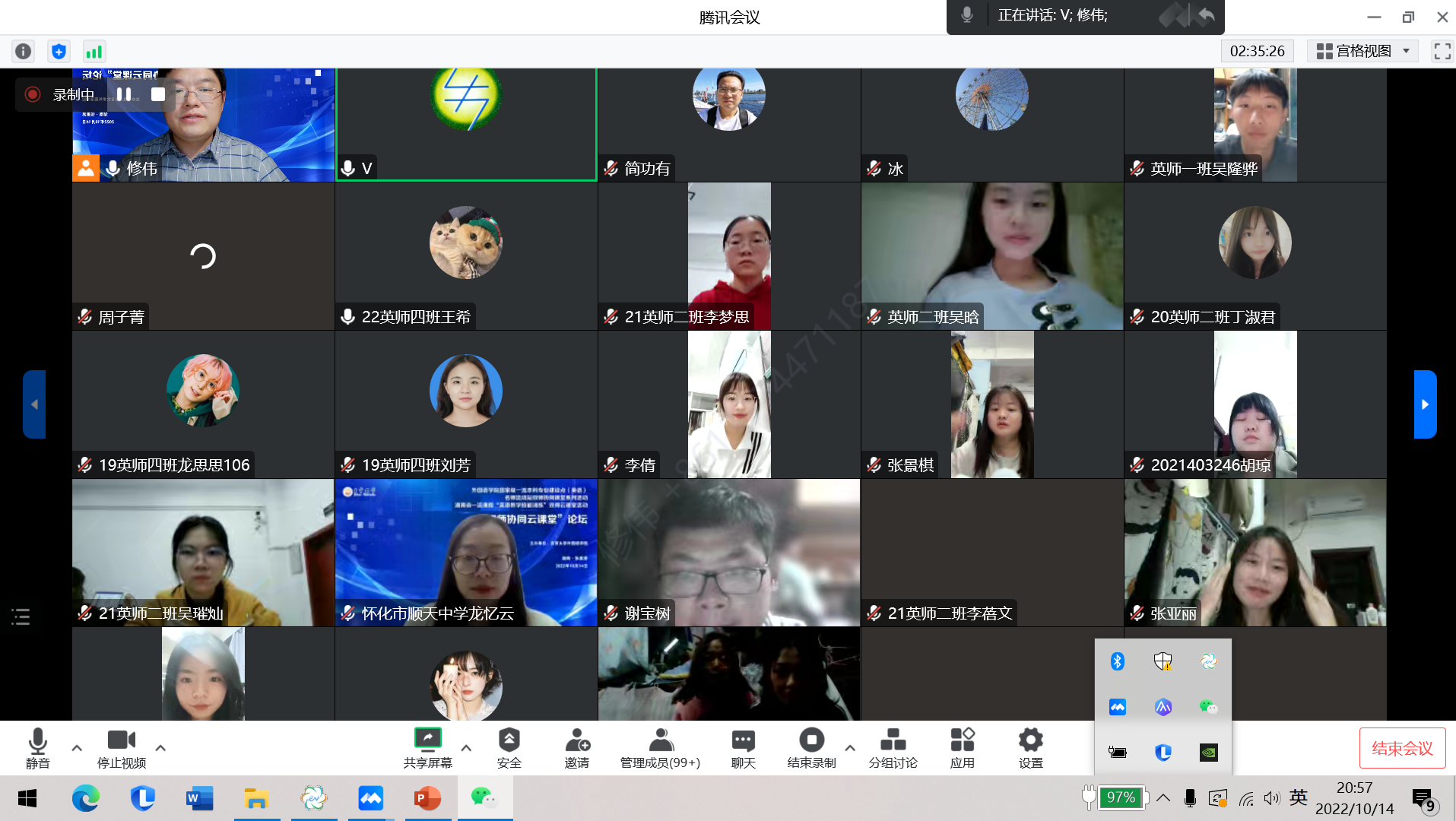 本网讯(修伟)10月14日晚,太阳成集团tyc33455cc名师流动站“双师协同云课堂”论坛在线上如期举行,邀请省级教学竞赛获奖者、来自怀化市鹤城区顺天中学石冰、龙忆云两位一线教师,以及公司中小学外语名师流动站首批驻站专家、来自张家界市教育科学研究院专职教研员伍杰作主题分享,拉开了该院为期一个月的国家级一流本科专业建设点(英语专业)名师流动站双师协同课堂系列活动暨湖南省一流课程(“英语教学技能训练”) 双师云课堂活动的序幕。该院经理刘汝荣、副经理简功友、外语教师教育课程团队教师及2019级、2020级全体师范生近300人与会。论坛由该院教师修伟主持。