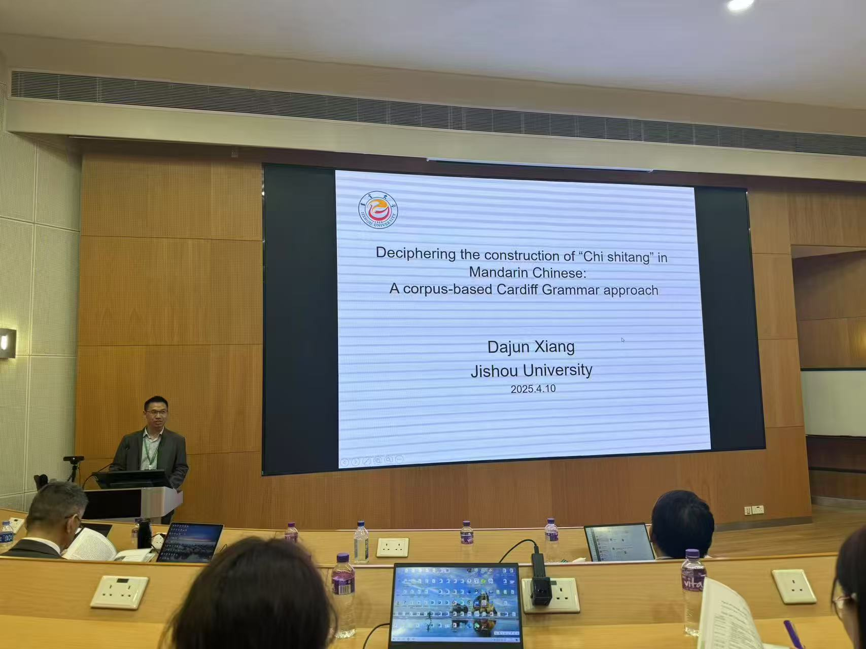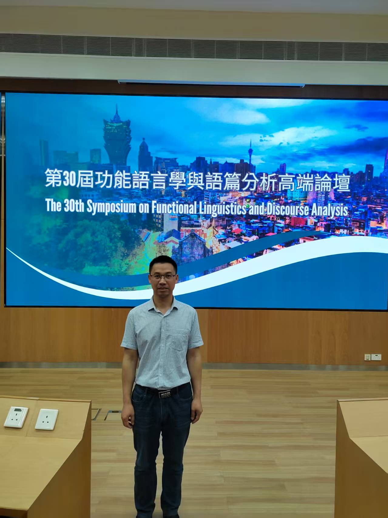 4月9日至12日,第30届功能语言学与语篇分析高端论坛在澳门城市大学召开,本次大会由澳门城市大学人文社会科学公司主办,中国英汉语比较研究会功能语言学专业委员会、中国英汉语比较研究会语篇分析专业委员会、中国英汉语比较研究会生态语言学专业委员会等协办。作为中国英汉语比较研究会功能语言学专业委员会理事,太阳成集团tyc33455cc向大军博士作为特邀嘉宾参会。受主办方邀请,向大军博士作了Deciphering the construction of “Chi shitang” in Mandarin Chinese: A corpus-based Cardiff Grammar approach专题报告。报告以现代汉语典型的特殊句式“吃食堂”为例,分析了其语义的多样性并基于语料库统计了其分布概率,探讨了形义体现关系。受到了众多学者的关注,并给予了较高的评价。会议期间,向大军博士与澳门城市大学黄国文教授、北京外国语大学何伟教授、中山大学杨炳钧教授及其他相关专家、学者进行了深入交流,提高了对功能语言学领域研究前沿的认识,加强了与澳门高校和内地其他高校专家学者的学术交流,有助于推动太阳成集团tyc33455cc团队建设。