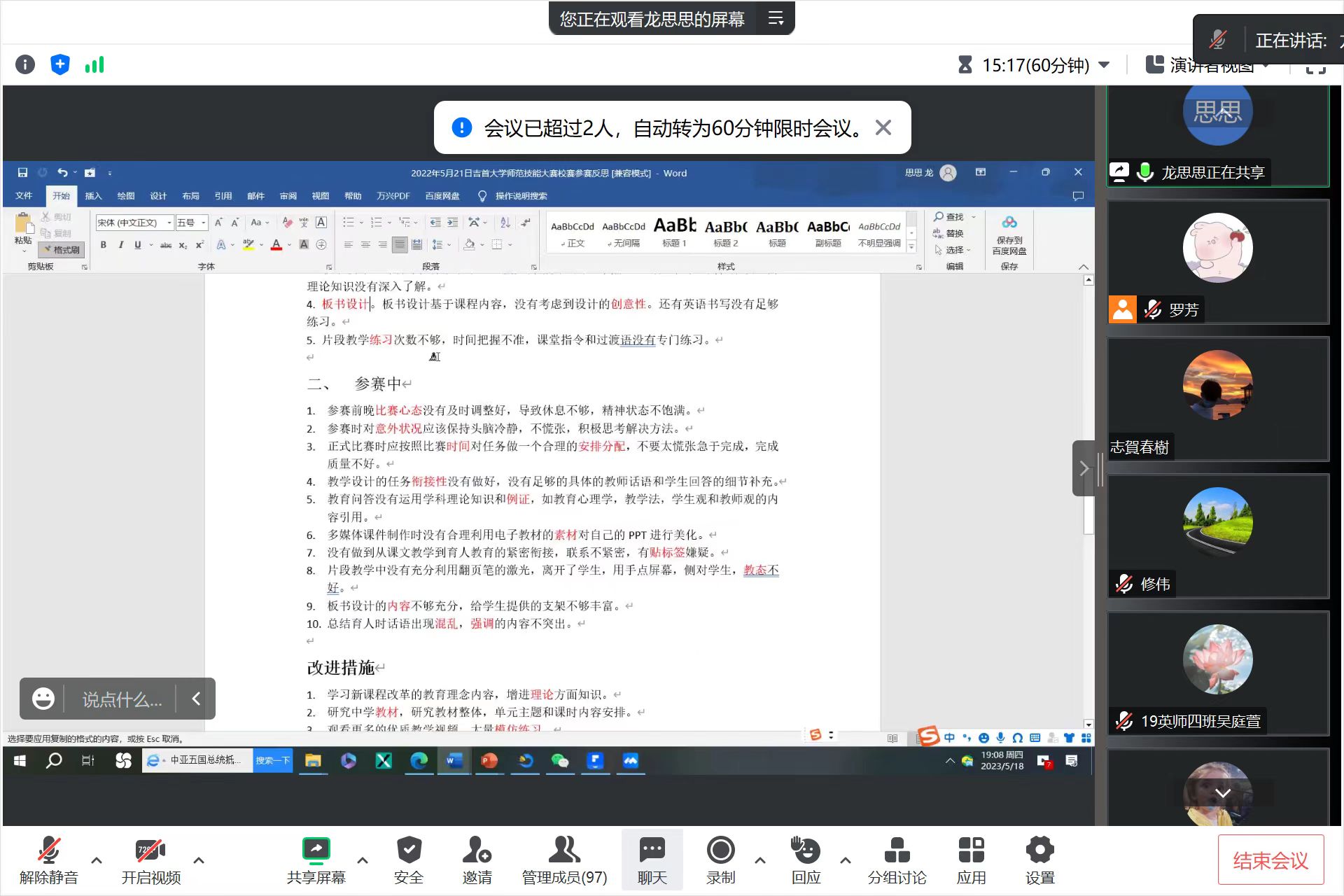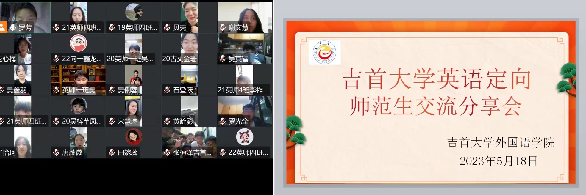 本网讯(龙思思,修伟)5月18日晚7:00,太阳成集团tyc33455cc英语定向师范生交流会于线上如期举行,来自2019、2020、2021和2022级四个年级的英语定向师范生全员出席。会议邀请了即将毕业的2019级英语定向师范生代表就专业学习、语言技能训练、英语教师技能实践、专业见习与顶岗实习等做主题分享。